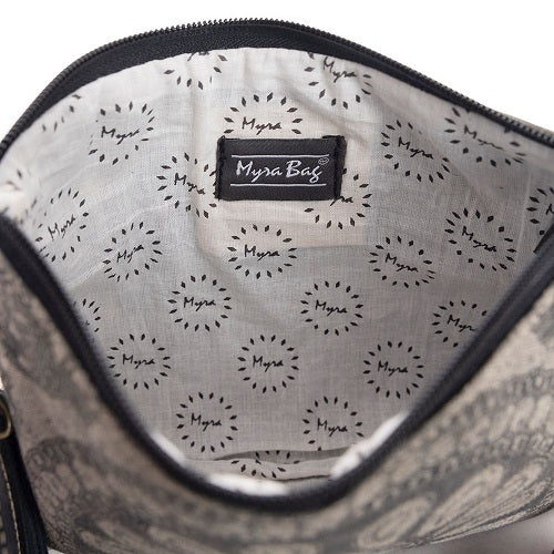 This lovely bag features a captivating medallion pattern that embraces a wonderfully timeless charm. Crafted for both durability and style, it's perfect whenever you're busy on the go. Top zipper closure. Includes a wonderfully detailed wristlet carrying strap in wide ebony leather with special stitching. The detachable, adjustable shoulder strap is in matching leather. A bag you'll love - and so will your admirers!